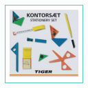 Een compleet kantoorset van puntenslijper, schaar, rolmaat, punaises, kladpapier, pen, magneet, paperclips en gum.
