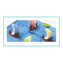 Vikingschepen zitten vast in een gigantische maalstroom op zee. Kan jij de schepen veilig uit de storm loodsen? Bij dit originele denkspel bewegen de schepen op een heel speciale manier, namelijk door de boten te draaien doorheen de puzzelstukken met het water. Maar opgelet! Vaak zullen sommige puzzelstukken de beweging van andere blokkeren. Enkel een gewiekste Viking met inzicht in de beweging van de draaikolken zal kunnen ontsnappen aan de draaikolken. Inhoud: spelbord, 4 drakars (schepen) + 4 pijlen voor de eindpositie, 9 ronde puzzelstukken, boekje met 60 opdrachten en oplossingen.