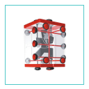 De Brainstring Houdini puzzel bestaat uit een doorzichtige kubus met daarin rubberen touwtjes met knoppen in verschilllende kleuren aan het eind.
