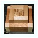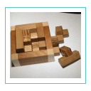 Een pakprobleem met rechthoekige vormen. Vijf stukken zijn ongelijk en asymmetrisch, heeft drie lagen. Hij heeft ook een unieke oplossing. Hout: doos: Mahonie en Esdoorn. stukken: Noten en Zebrano. Stukken: 7